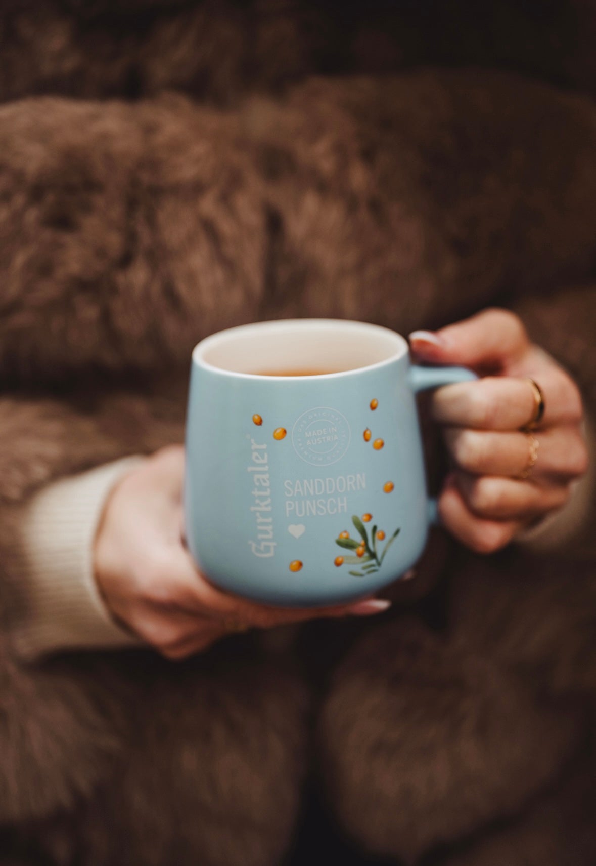 Dieses hochwertige Keramik-Häferl in einem sanften Blau ist der ideale Begleiter für gemütliche Punsch- und Teemomente. Auf der Vorderseite ist das Gurktaler Design mit dem Schriftzug „Sanddorn Punsch“ aufgebracht, ergänzt durch dekorative Sanddornbeeren und Blätter, die dem Häferl einen frischen, natürlichen Akzent verleihen.